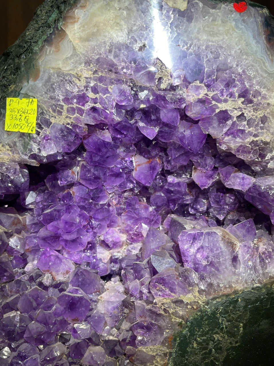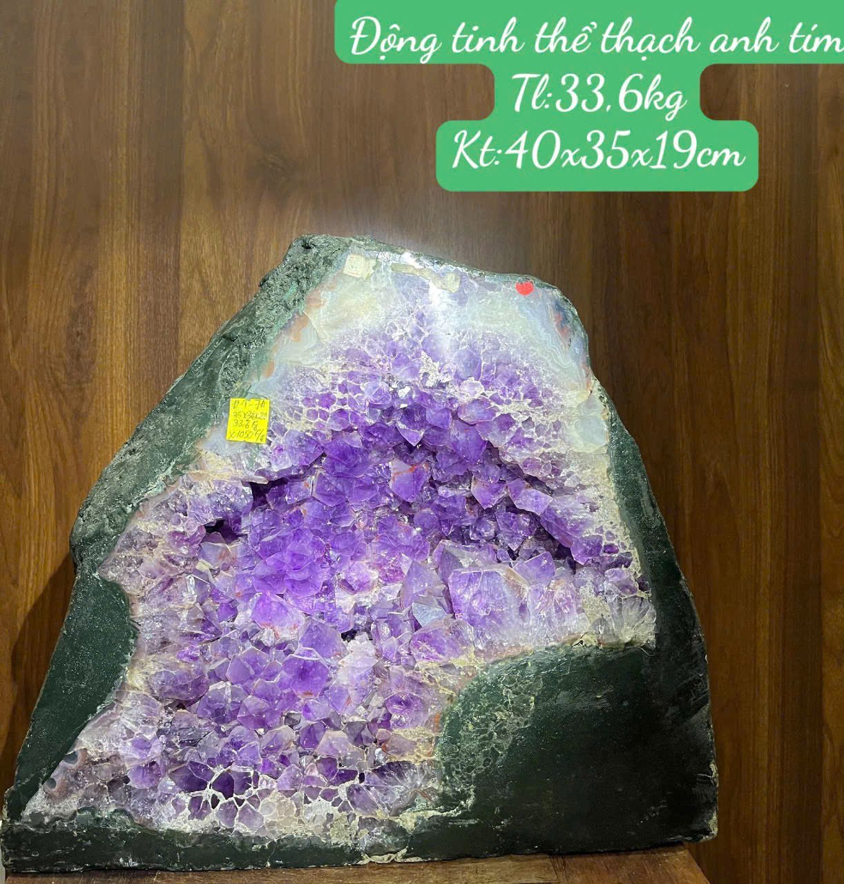 Động tinh thể Thạch Anh Tím thiên nhiên nguyên khối, trọng lượng 33,6kg, kích thước 40x35x19cm. Các tinh thể tím óng ánh, kết tinh sắc nét, mang vẻ đẹp sang trọng và huyền bí.