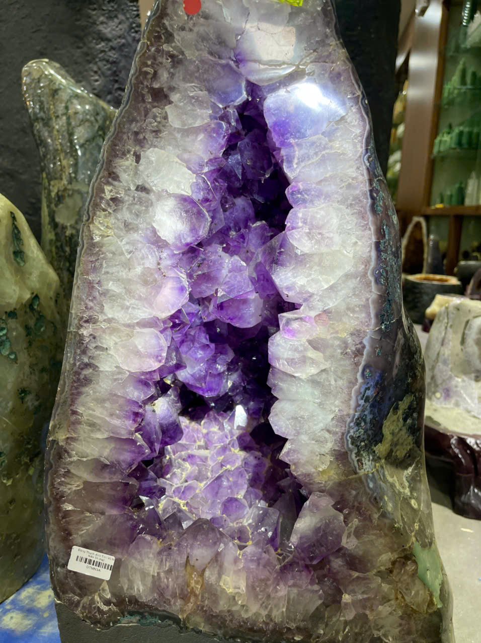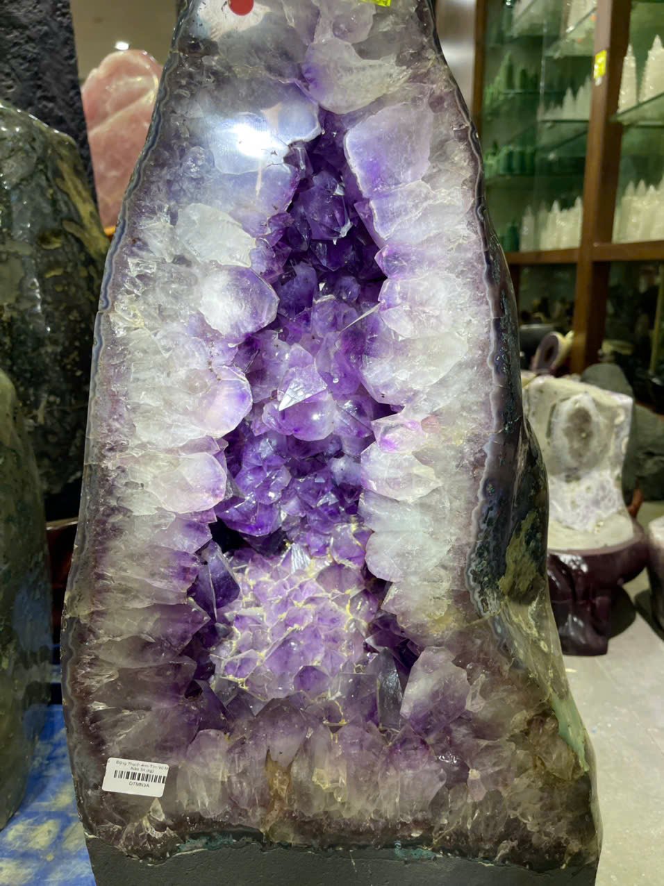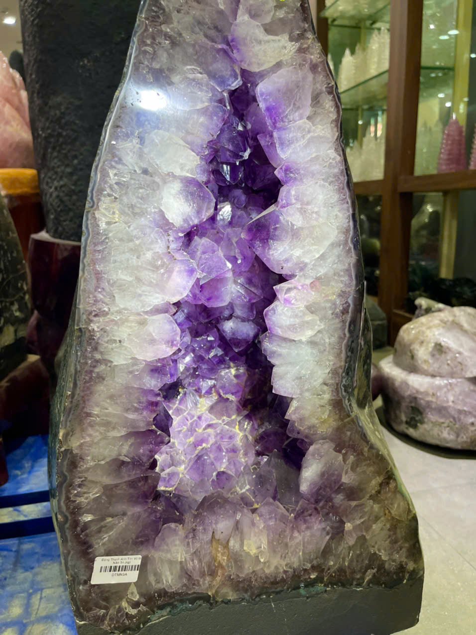 Bên trong là lớp tinh thể thạch anh tím óng ánh, mọc dày, tinh khiết, ánh tím sâu sang trọng.