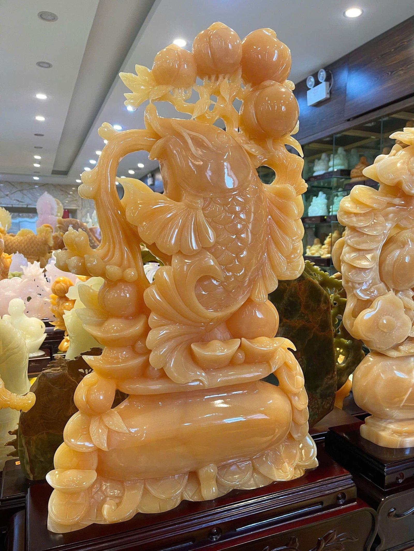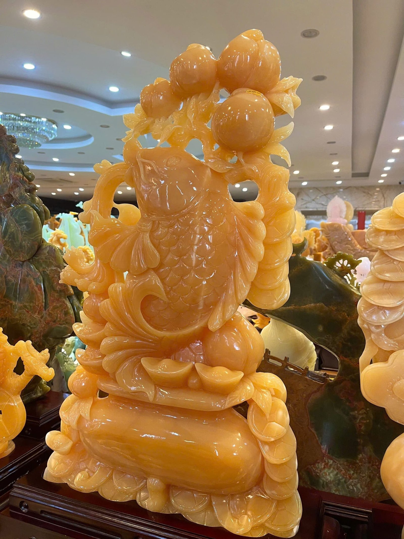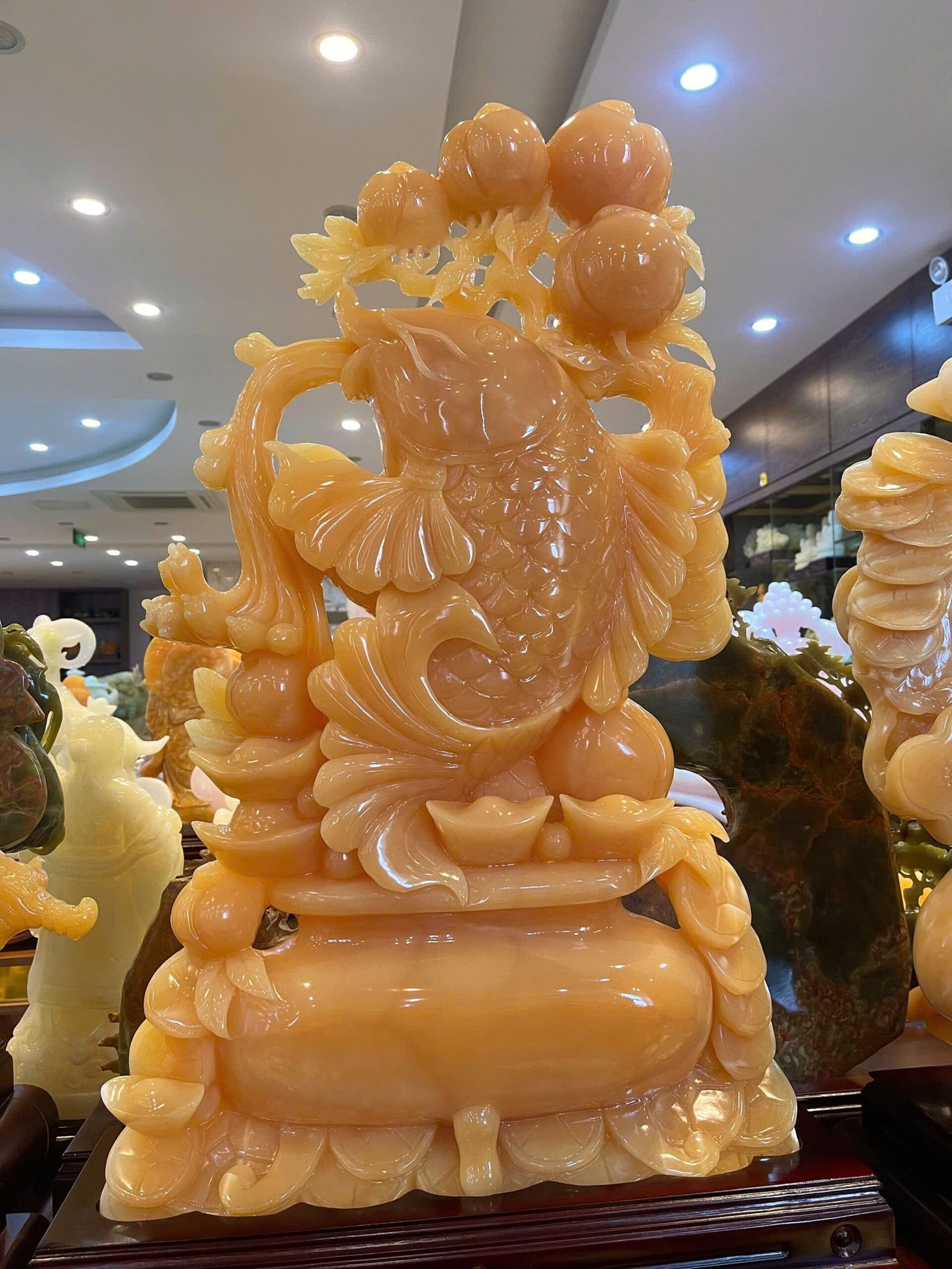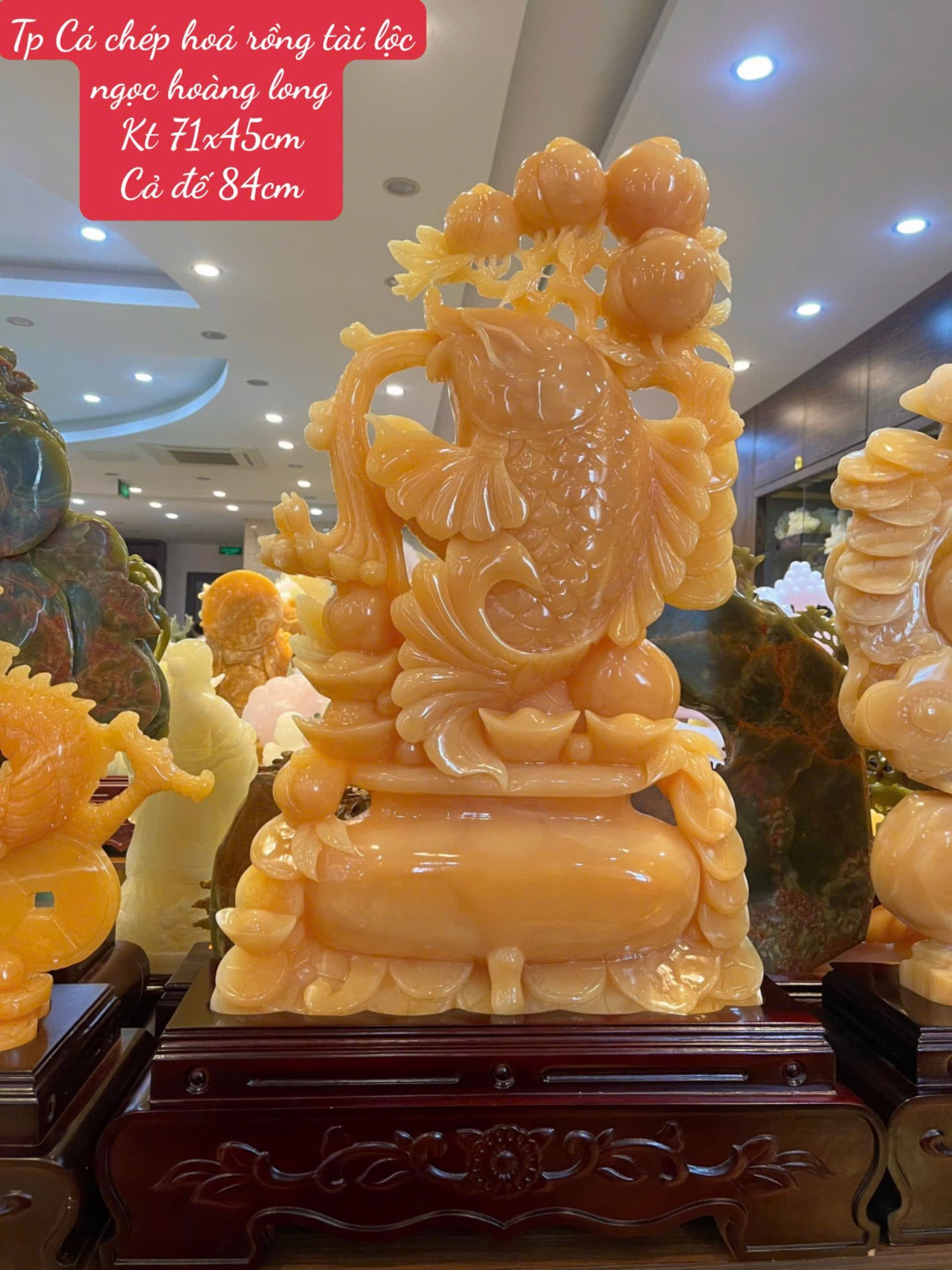 Tác phẩm Cá Chép Hóa Rồng được chế tác từ ngọc Hoàng Long tự nhiên – một loại ngọc quý hiếm có sắc vàng óng rực rỡ, tượng trưng cho sự cao quý, giàu sang và may mắn. Tác phẩm khắc họa hình ảnh cá chép vượt vũ môn, hóa thành rồng – một biểu tượng huyền thoại của nghị lực, ý chí vươn lên và thành công viên mãn.