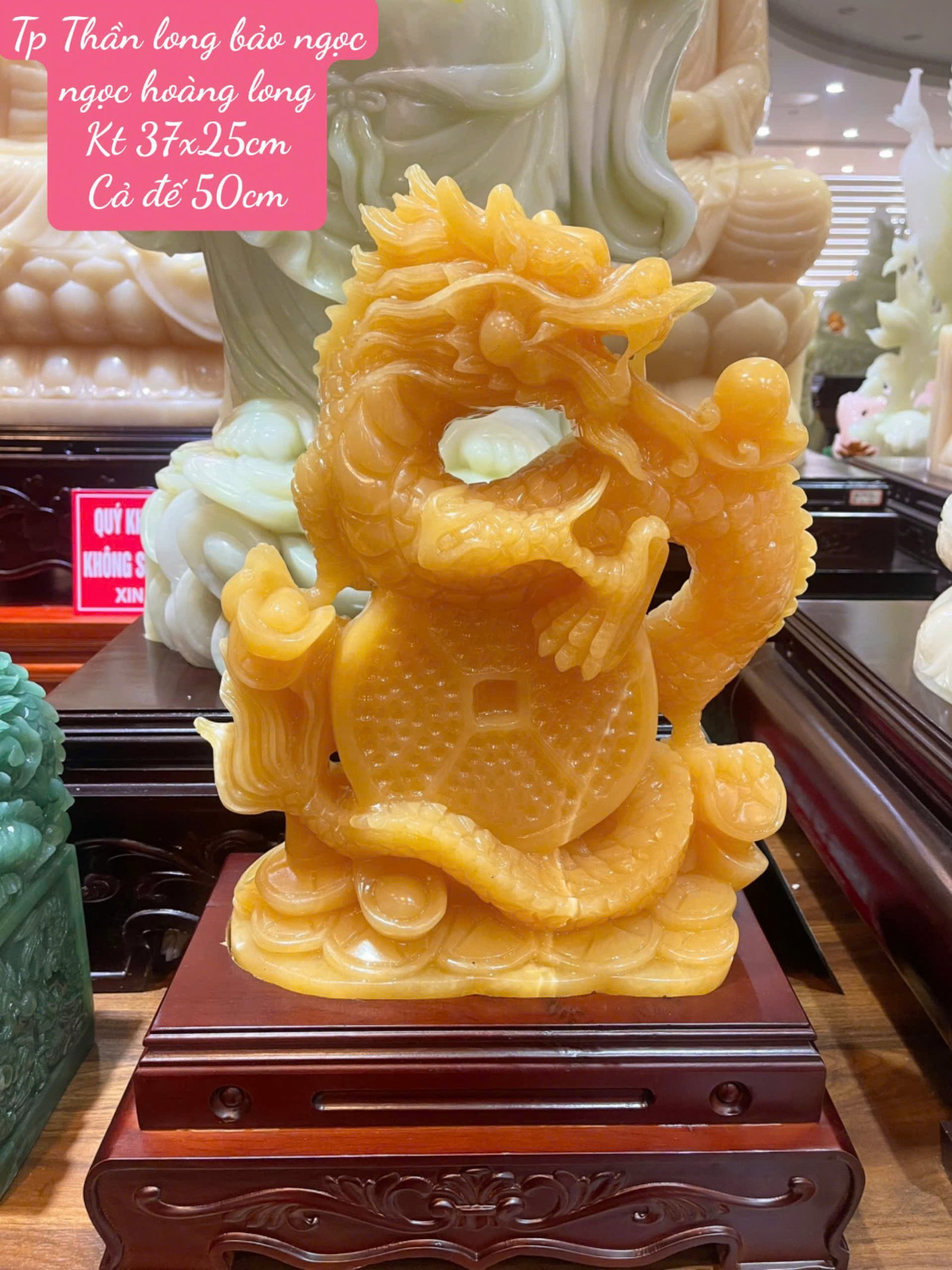 Chế tác hoàn toàn từ ngọc Hoàng Long tự nhiên, sắc vàng óng ánh sang trọng, tượng trưng cho quyền lực, phú quý và sự thịnh vượng.